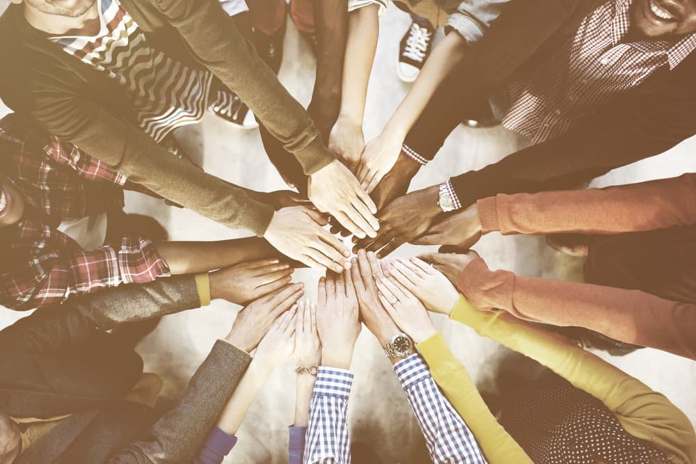 A photo from above with several people all extending their hands out to meet in the middle, symbolizing togetherness.