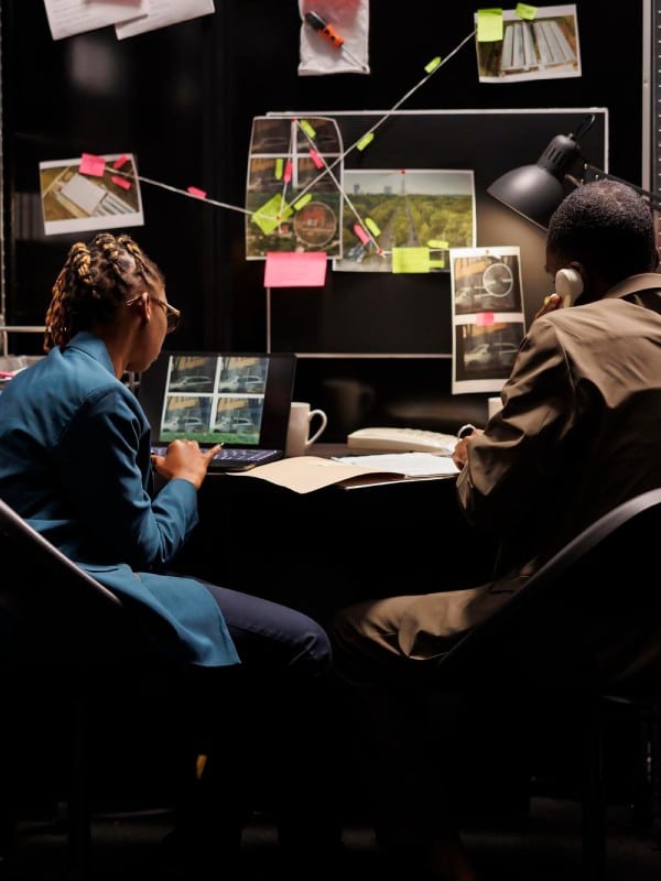 Investigators checking photos and talking with client on phone